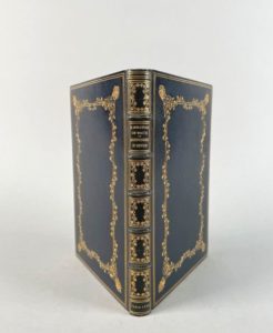 VOGÜÉ Melchior de. Histoires d'hiver. Paris, Calmann-Lévy, 1885 ; pet. in-8, reliure de l'époque maroquin vert sombre, sur les plats large cadre décoratif doré, dos à nerfs très orné de motifs dorés, 6 filets intérieurs dorés, tranches dorées, couverture, chemise et étui (Thierry suc. de Petit-Simier).