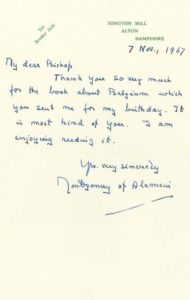 Bernard Law MONTGOMERY (1887-1976) Field Marshal britannique. L.A.S. " Montgomery of Alamein ", Isington Mill 7 novembre 1967, à Mgr. Van Wayenbergh, " Recteur Magnifique " de l'Université catholique de Louvain ; ¾ page in-8 à son adresse, enveloppe ; en anglais.