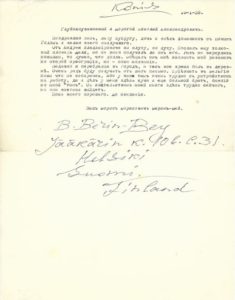 Correspondance privée entre B. Berin-Beï et A. Balashov. Réflexions sur l’église et l’Union soviétique, échanges sur les travaux littéraires des deux écrivains, des souvenirs de B. Berin-Beï sur sa vie dans les camps sibériens. 1950-1967. Tapuscrits, lettres autographes, télégrammes, cartes, cartes-postales, enveloppes. Environ 76 pp. Nous y joignons plusieurs journaux finlandais.