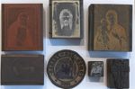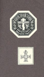 • Plaque en métal pour les timbres « Dieu sauve la Russie », 9 х 2,5 х 17 cm, plaque en métal pour les timbres avec la croix de la Confrérie, 9,5 х 2,5 х 17 cm, plaque en métal pour les timbres de l’Union «Tous pour le Patrie», 9 х 2,3 х 6,5 cm, plaque en métal pour les timbres avec le portrait du général Wrangel, 9,5 х 2,5 х 18,3 cm ; plaque en métal pour les timbres avec le portrait de l’empereur Nicolas II (5 х 2,3 х 3,3 cm), avec le portrait du Grand Duc Nicolas Nikolaevitch (5 х 2,3 х 3,7 cm), avec le portrait du général Wrangel (5 х 2,3 х 4 cm), avec la Vierge Marie (5 х 2,3 х 4,5 cm), avec le Mandylion (4 х 2,3 х 4 cm), avec le portrait d’Alexandra Feodorovna (4,5 х 2,3 х 3,3 cm ), avec un saint (5 х 2,3 х 4,5 cm) ; plaque en métal avec les croix de la Confrérie (3 cm ; 2 cm ; 1,7 cm ; 1,8 cm) ; 3 rondes pour les cachets de la Confrérie (4,3 cm ;5 cm ; 5 cm) ; pour les cachets de la Confrérie de la Vérité russe, de l’Union «Tous pour la Patrie», la Confrérie de la Vérité russe pour les musulmans, formats différents.
