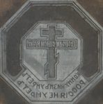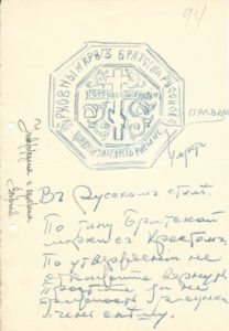 Dessin préparatoire pour l’insigne de la Confrérie de la Vérité russe avec le slogan «Le communisme mourra, la Russie ne mourra pas». Crayon bleu sur papier, avec des notes d’A.Balashov en bas de la feuille. 26,5 х 18 cm. Nous y joignons une plaque en métal pour l’impression de cet insigne de la Confrérie. 18 х 2 х 17 cm. B.E.