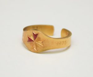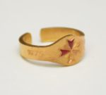 Перстень в память 200летия Лейб-гвардии Казачьего Его Величества полка. Даты 1775 и 1975 гравированы. Метал, золочение, красная эмаль. Д: 2 см. Общ.хор.сост. (скол на эмали).