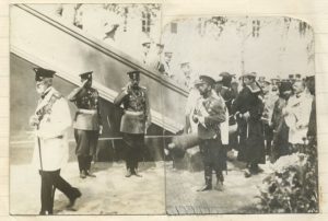 Photographie argentique représentant l’empereur Nicolas II et le tsarévitch Alekseï avec leur suite. 88 x 128 mm. En l’état (déchirée en deux parties).