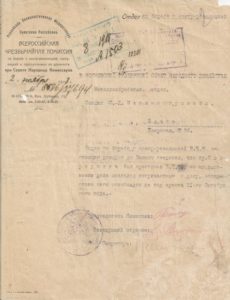 Tapuscrit sur papier à en-tête de "VTCHK" (commission extraordinaire de toute la Russie), daté 2.11.1918, comporte la signature de Peters Yakov ; tampons. 1 p., in - 4.