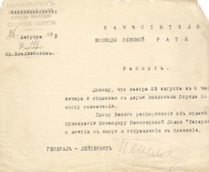 Rapport tapuscrit concernant la compagnie maritime à bord du bateau « Batareya », N°149, 28.08.1922 à Vladivostok. 1 p., papier à en-tête ; photographie en noir et blanc représentant le général Pepeliaev. 70 x 45 mm (accident). Nous y joignons une lettre tapuscrite signée par le contre-amiral Georges Stark adressé au commandant de la chaloupe canonnière «Batareya». 22.08.2 (22), 1 p.
