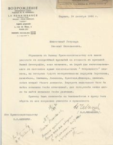 Lettre tapuscrite signée adressée au général Udenitch. 1 pp, papier à en-tête du quotidien russe «La Renaissance», 16.12.1930 ? Paris ; en bas de la lettre - réponse manuscrite du général Udenitch, 18.12.1930. Le quotidien «La Renaissance» demande au général d’envoyer sa photographie qui sera utilisée pour la création d’une affiche.