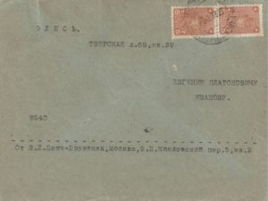 Lettre tapuscrite signée de Bontch-Brouevitch adressée à l’écrivain Eugène Ivanov, années 1930, enveloppe. 2 pp., in-4. Bontch-Brouevitch insiste auprès E.Ivanov pour qu’il donne gratuitement au Musée de la littérature de Moscou tous les documents et les archives qui sont en sa possession et qui concernent des écrivains et des poètes du XXe siècle.