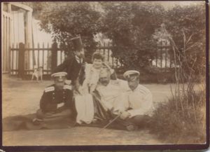 DEUX PHOTOS ALBUMINEES représentant Marie Vuillaume (chanteuse à l'Opéra) entourée des Grands Ducs. 80 x 115 mm. et 120 x 170 mm. Nous y joignons une lithographie portrait d’Alexandre III "My August Master", page de Vanity Fair, datée 11 octobre 1884. 270 x 395 mm.
