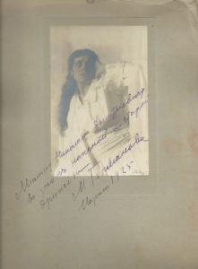 Photographie argentique contrecollée sur carton d’atelier (cachet au dos), dédicacée en russe par Maria Germanova au peintre russe Nicolas Millioti, datée 1925 à Paris. 163 x 108 mm.