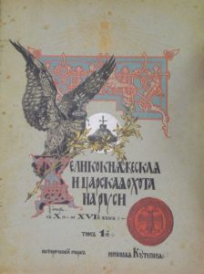 Царская охота на Руси: Исторический очерк Николая Кутепова. Изд.Экспедиция заготовления государственных бумаг, 1896–1911. Том 1й. Из 4х. Т. 1: Великокняжеская и царская охота на Руси с X по XVI век. 1896. XVI, 212 стр. ил., 1 л. фронт. (ил.), 7 л. ил. 35 х 27 см. Владельческий полукожаный переплет с золотым тиснением по корешку. В состоянии (Следы жука, нехватка частей корешка, заломы углов). Тираж первого тома 400 экземпляров.