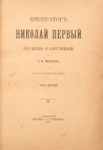 Император Николай Первый: Его жизнь и царствование: [в 2 т.]. СПб.: изд. А.С. Суворина, 1903. Т. 1. [6], 800 с., 39 л. ил., портр., факс.: ил.; Т. 2. [4], 820 с., 31 л. ил., портр., факс.: ил.; 29,3 х 23 см. Полукожаный переплет эпохи (потертости). Общ.хор.сост. (пятна, надрывы). Редка.