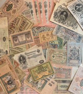 roubles 1918 ; 1000 roubles 1919, 2 pièces ; 3 roubles 1919. Et d’autres billets des années 1910-1920, env. 50