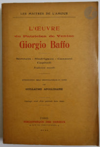 brochés..Cet ensemble comprend les titres suivants :..L'ŒUVRE DU DIVIN ARÉTIN. Première partie. 1909. [Un des 100 exemplaires sur papier d'Arches (n° 62)]. — L'ŒUVRE DU MARQUIS DE SADE. 1909. [Exemplaire sur papier ordinaire]. — L'ŒUVRE DU PATRICIEN DE VENISE GIORGIO BAFFO. 1910. [Un des 10 premiers exemplaires sur japon impérial (n° 10)]. — L'ŒUVRE LIBERTINE DES CONTEURS ITALIENS. Première partie. Les Conteurs du XVIIIe Siècle. 1910. [Un des 10 premiers exemplaires sur japon impérial (n° 10)]. Dos décollé. — L'ŒUVRE DU CHEVALIER ANDREA DE NERCIAT. 1910. [Exemplaire sur japon impérial, justifié par l'éditeur « Exemplaire hors commerce »] — L'ŒUVRE DU CHEVALIER ANDREA DE NERCIAT. Deuxième partie. 1911. [Exemplaire sur japon impérial, justifié par l'éditeur « Exemplaire hors commerce »]. — L'ŒUVRE DU CHEVALIER ANDREA DE NERCIAT. Troisième partie. 1912. [Exemplaire sur japon impérial, justifié par l'éditeur « Exemplaire hors commerce »]. — L'ŒUVRE DES CONTEURS ALLEMANDS. 1913. [Un des 10 premiers exemplaires sur japon impérial (n° 10)]...Les préfaces d'Apollinaire sont toutes en édition originale...Quelques salissures aux couvertures...On joint, de Guillaume Apollinaire :..- L'HÉRÉSIARQUE & CIE. Paris : P.-V. Stock, 1910. — In-18, broché..Édition originale dédiée à Thadée Natanson..Exemplaire sur papier d'édition, très bien conservé. Quelques petites salissures sans gravité à la couverture...- [COLLECTIF]. APOLLINAIRE. Paris : Éditions de l'Esprit nouveau, librairie Jean Budry & Cie, [1924]. — In-4, broché..Numéro spécial de la revue « L'Esprit nouveau » consacré à Guillaume Apollinaire, comprenant un conte inédit de ce dernier, reproduit en fac-similé du manuscrit, ainsi que des textes sur le poète par Roch Grey, André Salmon, Paul Dermée, Guillaume Kostrowitzky, Pierre Albert-Birot, Henri Hertz, etc. Le numéro est également illustré de compositions de Picasso, Marcoussis, Apollinaire, etc..Couverture salie. Joint la bande-annonce.