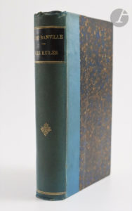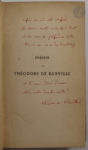 :..« A M Michelet // Hommage dévoué // Th. de Banville »..Exemplaire très bien conservé, malgré le dos passé et quelques rousseurs éparses...- POÉSIES. LES EXILÉS. LES PRINCESSES. Paris : Alphonse Lemerre, 1875. — In-16, demi-toile bleue, dos lisse, tranches mouchetées (reliure de l'époque)..Nouvelle édition, illustrée d'un portrait de l'auteur en frontispice. Le recueil se termine par trois textes de Théophile Gautier, Charles Baudelaire et Sainte-Beuve, introduits sous le titre général « Théodore de Banville poète lyrique »...Exemplaire du tirage courant, enrichi sur le faux titre de la copie autographe signée par Théodore de Banville des 6 derniers vers de son poème « Le Saut du tremplin » tiré des « Odes funambulesques »...Dos légèrement bruni.