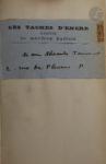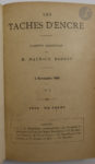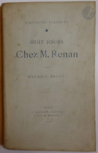 IMPÉRIAL (n° 17)...- Dialogues parisiens. HUIT JOURS CHEZ M. RENAN. Paris : A. Dupret, 1888. — In-24, broché..Édition originale rare, dont il n'a pas été tiré de grands papiers..Importantes rousseurs...- LE MYSTÈRE EN PLEINE LUMIÈRE. Paris : Librairie Plon, les petits-fils de Plon et Nourrit, [1926]. — In-8, broché, couverture rempliée..Édition originale en second tirage, publiée dans la série des « Œuvres complètes de Maurice Barrès » au format in-8. L'originale en premier tirage, beaucoup plus courante, parut sur papier d'alfa au format in-18..Un des 100 exemplaires sur papier du Japon (n° 133), second papier après 50 exemplaires sur chine...- LES TACHES D'ENCRE. GAZETTE MENSUELLE. [Paris], 5 novembre 1884-Février 1885. — 4 fascicules en un volume in-18, demi-parchemin blanc, dos lisse, tranches mouchetées, couvertures conservées (reliure de l'époque)..Collection complète de cette revue éphémère rédigée par Maurice Barrès, formée de seulement 4 fascicules parus entre le 5 novembre 1884 et février 1885..Exemplaire complet des couvertures, à l'exception du second plat de la première livraison. La couverture de la seconde livraison comporte bien les taches d'encre faites par Barrès. On trouve réunis à la fin plusieurs feuillets de souscription pour la gazette, de publicités pour la librairie européenne et des pages de chroniques intitulées « Le Mouvement littéraire contemporain » et « Bulletin financier »..Quelques salissures à la reliure. Sur la première garde a été collé un morceau d'enveloppe à l'en-tête de la revue, portant le nom manuscrit du souscripteur, à savoir M. Alexandre Tausserat habitant 2 rue de Fleurus à Paris.