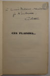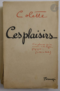 COLETTE..Ces plaisirs….Paris : Ferenczi & Fils, [1932]. — In-12, broché..Édition originale. Un des 1050 exemplaires sur vélin bibliophile (n° 493)...Exemplaire de Lucie Delarue-Mardrus (1874-1945), enrichi de cet envoi de Colette sur le faux...