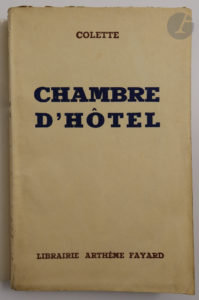 COLETTE..Chambre d'hôtel..Paris : Librairie Arthème Fayard, [1940]. — In-12, broché..Édition originale...Exemplaire du service de presse, enrichi d'un envoi autographe de Colette à l'autrice Lucie Delarue Mardrus (1874-1945) :.« à // Lucie...