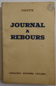 COLETTE..Journal à Rebours..Paris : Librairie Arthème Fayard, [1941]. — In-12, broché..Édition originale...Exemplaire du service de presse, enrichi d'un envoi autographe de Colette à l'autrice Lucie Delarue-Mardrus (1874-1945) :.« À Lucie...