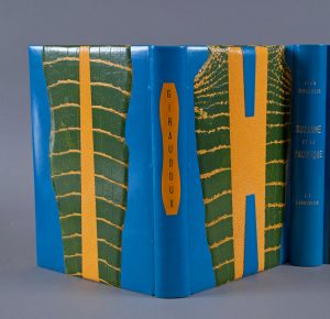 Reliure box bleu ciel, dos lisse portant le nom de l'auteur sur une pièce orange mosaïquée en long, plats ornés d'une large peau de reptile verte et orange, la partie centrale mosaïquée de galuchat orange, avec au plat supérieur 2 languettes de box bleu, doublures et gardes de daim vert amande, couverture et dos de papier bois nacré conservés, chemise demi-box bleu ciel portant le titre et les noms d'auteur et illustrateur dorés, doublée de feutre gris, étui bordé de box de même teinte. [Rel. A. Devauchelle, 2009].