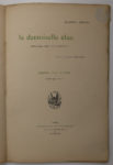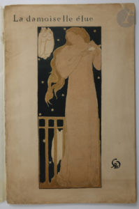 l'Œuvre gravé de M. Denis », n° 30...Édition originale, dédiée à Paul Duka, de la partition pour chant et piano de cette célèbre cantate composée par Claude Debussy sur un livret de Dante Gabriel Rossetti...Cet ouvrage est l'un des plus emblématiques de l'Art nouveau. La couverture est illustrée d'une superbe lithographie de Maurice Denis, que Debussy n'hésitait pas à qualifier de « rare et précieuse », représentant la Damoiselle élue, debout devant une balustrade, entourée d'une nuit étoilée où voltigent les âmes heureuses et les anges. C'était l'une des premières compositions que le peintre réalisait pour un livre ; il n'était alors âgé que de 23 ans et venait tout juste de quitter l'iconographie traditionnelle pour se tourner vers le symbolisme. Cette illustration additionnée à la partition, fit que cette plaquette attira dès sa parution aussi bien les mélomanes que les peintres, les poètes et bien sûr les bibliophiles...L'édition ne fut tirée qu'à 160 exemplaires ; celui-ci est l'un des 125 sur vélin blanc (n° 116)...Couverture salie, restauration à un coin du premier plat, déchirures et manques au dos. Le premier et le dernier feuillet ont été collés aux gardes, laissant apparaître quelques traces claires de colle dans les marges intérieures. Auréoles rousses claires dans les marges des pages 11 à 21.