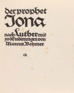 .1920-1930.--LIBRO: .(ARTE-BIBLIOFILIA)-. .LUTHER, MARTIN (trad.); BEHEMER, MARCUS:--.DER PROPHET JONA.--Leipzig: Insel Verlag, 1920-1930. 8º menor. 27 p. + 1 h. Portada litográfica. Ilustr. con 12 aguafuertes en el texto de M. Behemer: 7 grabados...