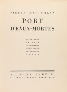 .1926-. LIBRO: .(BIBLIOFILIA)-. .MAC ORLAN, PIERRE:--.PORT D´EAUX-MORTES-. Paris: Au Sans Paril, 1926. 8º mayor. 3 h. + 80 p. + 1 h. Ilustr. con 8 litografías de Georges Grosz. Rústica edit.