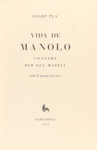 .1928-. LIBRO: .(BIBLIOFILIA)-. .PLA, JOSEP:--.VIDA DE MANOLO CONTADA PER ELL MATEIX. Amb 25 gravats fora de text.--Sabadell: Joan Sallent, impressor, 1928. 4º menor. 153 p., 2 h. y 25 láminas, 1 h. Enc. tela ed. Ejemplar del tiraje de 550...