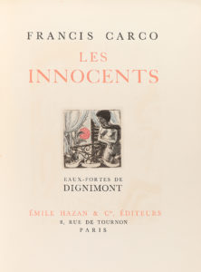 .1930.--LIBRO: .(BIBLIOFILIA)-. .CARCO, FRANCIS:--.LES INNOCENTS.--Paris: Emile Hazan & cie. Editeurs, 1930. 8º mayor. 4 h. + 203 p. + 1 h. Ilustr. con grabados al aguafuerte, coloreados, por Dignimont. Edición numerada de 830 ejemplares. Rústica...