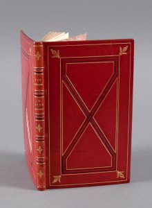 ornés d'un jeu de filets noirs et dorés, fleurons en écoinçons, coupes guillochées aux coins, roulette dorée bordant les contreplats, tête dorée, couvertures conservées, gardes brodées roses, étui [Yseux successeur de Simier] (étui lég. frotté, dos très lég. passé).