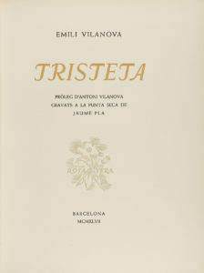 .1947-. LIBRO: .(BIBLIOFILIA)-. .VILANOVA, EMILI; PLA, JAUME (ilustr.):--.TRISTETA.--Pròleg Antoni Vilanova. Barcelona: Ed. Rosa Vera, 1947. 4º.. -Societat Aliança d´Arts Gràfiques, 1947. 4º menor. 143 p. 14 grabados a la punta seca de Jaume...