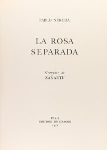 .1972.--LIBRO: .(BIBLIOFILIA).--.NERUDA, PABLO; ZAÑARTU:.--.LA ROSA SEPARADA.--Paris: Eds. du Dragon, 1972. Folio menor. 24 poemas ilustr. con grabados de ZAÑARTU. Ejemplar en rama, rústica. Cubiertas y petaca en tela editorial. Edición numerada...