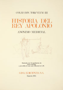 .1975-. LIBRO: .(BIBLIOFILIA)-. .HISTORIA DEL REY APOLONIO. ANONIMO MEDIEVAL.--Madrid: Gisa Ediciones, 1975. Gran folio. 55 p. + 10 aguafuertes de Oscar Estruga. Ilustraciones del mismo artista en el texto. Edición numerada de 151 ejemplares, este...