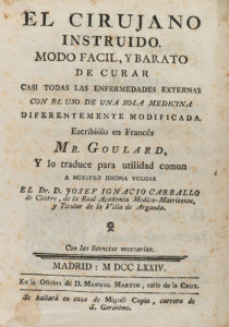 .1761-1774-. LIBRO: .(MEDICINA)-. .GOULARD; VAN-SWIETEN, BARON DE:--.EL CIRUJANO INSTRUIDO. MODO FACIL, Y BARATO DE CURAR CASI TODAS LAS ENFERMEDADES EXTERNAS CON EL USO DE UNA SOLA MEDICINA DIFERENTEMENTE MODIFICADA-. Trad. Josef Ignacio Carballo....