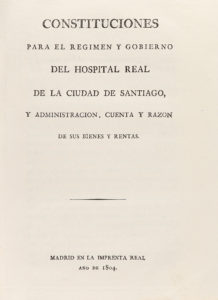 .1804-. LIBRO: .(ADMINISTRACIÓN-HOSPITAL)-. .[AYESTERAN, IGNACIO DE:]-. .CONSTITUCIONES PARA EL REGIMEN Y GOBIERNO DEL HOSPITAL REAL DE LA CIUDAD DE SANTIAGO, Y ADMINISTRACION, CUENTA Y RAZON DE SUS BIENES Y RENTAS.--Madrid: Imp. Real, 1804. 8º...
