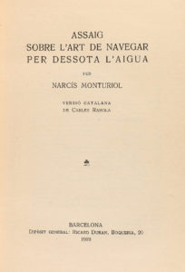 .1919-. LIBRO: .(NAVEGACIÓN-CIENCIA)-. .MONTURIOL, NARCÍS:--.ASSAIG SOBRE L´ART DE NAVEGAR PER DESSOTA DE L´AIGUA.--Trad. catalana de Carles Rahola. Barcelona: Ricard Duran, 1919. 8º mayor. VII + 199 p. Enc. en tela de época, tejuelo.
