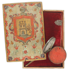 al final 5 h. en papel verjurado con sello estampillado. Presentada con un gran escudo orlado iluminado, le sigue la presentación orlada de los antecesores del solicitante de la ejecutoria, en el centro sello estampillado de CARLOS III, ambos protegidos con hojas en seda granate. La segunda parte presentada también con el escudo heráldico de los MARTINEZ, seguida del sello estampillado y nombre real de FERNANDO VI exquisitamente orlado e iluminado. Texto enmarcado a dos tintas e ilustrado con bellísimas capitales. Incluye un árbol genealógico orlado plegado. Sellos de papel, firmas notariales y estampillada ´Yo El Rey´. La última parte la forman 5 h. en papel verjurado escrito en recto y verso, tinta ferruginosa, con sello estampillado. JUAN JOSEPH ANTONIO MARTINEZ APARICIO vecino de Cádiz defiende su ascendencia de hidalguía en el linaje de los Martín Martínez originarios de Soria. Enc. en terciopelo rojo rematado con dos cierres de plata con motivos florales. Conserva el sello de lacre fragmentado en dos partes y con una pequeña falta, protegido en su caja de plomo. Todo ello presentado en una CAJA DE MADERA ORIGINAL en listones enlazados, exquisitamente decorada con el escudo familiar orlado en el plano principal y decoraciones florales en los laterales, algún retoque en la asidera, falta de una guía de cierre, interior posiblemente repintado.