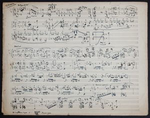 correspond aux 12 pièces de 12 mesures, d'inspiration dodécaphoniste manifeste, qu'Yvette Grimaud avait créées le 12 février 1945 au Tryptique. En fin de manuscrit, la mention " à Serge Nigg " a été grattée. Alors âgé de 20 ans, Boulez laisse transparaître dans ces " 12 notations " les influences de Schönberg et Messiaen, voire de Bartok et Jolivet pour certaines tournures. (N.B. : les 2 pages au crayon noir au verso des 2 pages in quarto à l'encre bleue constituent à un exercice de fugue à 4 voix qui ne semble pas en rapport avec les 4 pages de " Notations ").