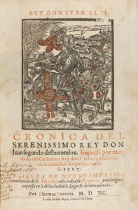 mayor. 34 h. + 317 p. Portada con gran grabado xilográfico a dos tintas. Texto a dos columnas. Hoja de licencia traspuesta, pero completo. Buenos márgenes, alguna restauración puntual y algún cerco de humedad pero buen ejemplar. Primera edición de Pamplona, es más corriente la del año siguiente. Enc. en plena piel con hierros decorados en ambos planos, nervios, alguna leve rozadura. Durante mucho tiempo se atribuyó esta crónica a Fernán Pérez de Guzmán, como lo atestigua en dorado la lomera. Palau 64968.