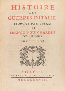 .1738-. LIBRO: .(HISTORIA DE ITALIA)-. .GUICHARDIN, FRANÇOIS [Trad.]:--.HISTORIDE DES GUERRES D´ITALIE.--Londres: Chez Paul & Isaac Vaillant, 1738. 3 vol. en 4º. I: 3 h. + XXVI p.+ 8 h. + 620 p. II: 2 h. + XI + 604 p. III: 5 h. + 476 p. + 96 h....