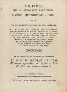 .1818-. FOLLETO: .(CAPUCHINOS-BARCELONA)-. .VÍCTIMAS DE LA ANÁRQUICA FEROCIDAD. ELÓGIO HISTÓRICO-FÚNEBRE, que en el solemne funeral mandó celebrar el M.R. P. Fr. Esteban de Barcelona Ministro Provincial de Menores Capuchinos de la Provincia de...
