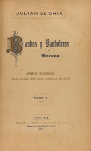 .1888-. LIBRO: .(GIRONA-BANDOLERISMO)-. .CHÍA, JULIAN DE:--.BANDOS Y BANDOLEROS EN GERONA.--Gerona: Imp. y librería de Paciano Torres, 1888. 3 vols. en 8º. I: 1 h . + IX + 395 p. Las 4 últimas p. con pérdida en el margen superior, sin afectar el...