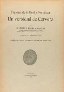 .1915-. LIBRO: .(HISTORIA-CERVERA)-. .RUBIO Y BORRÁS, MANUEL:--.HISTORIA DE LA REAL Y PONTIFICIA UNIVERSIDAD DE CERVERA.--Barcelona: Libr. Verdaguer, 1915. 2 vols. en 4º mayor. I: 496 p.+ 3 h. y láms. II: 390 p.+ 1 h.+ CCVIII p. y láms. Enc....