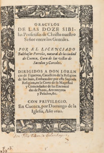 .1621.--LIBRO: .(HUMANIDADES)-. .PORREÑO, BALTHASAR:--.ORACULOS DE LAS DOZE SIBILAS Profetisas de Christo nuestro Señor entre los Gentiles.--Cuenca: Domingo de la Iglesia, 1621 [en portada y colofón]. 8º . 5 h. (de un total de 7 h.) + 72 fol....