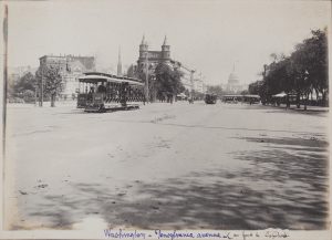 New York : bords de l'Hudson, bas de Broadway, statue du général La Fayette, Pont de Brooklyn, "Arc de triomphe temporaire érigé à l'occasion du retour de Cuba contre l'Espagne", Staten Island, Lac Hopatkong (Hopatcong), Philadelphie, Baltimore, Washington : parlement, maison blanche, bibliothèque, monuments et vues de la ville, Atlantic City : la plage. Vaisseau de retour de Cuba, navire de plaisance et voiliers.