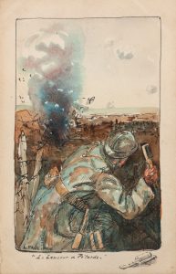 Scènes de tranchées, la "torpille", le lanceur de pétard, la reconnaissance, monuments et paysages en ruines (Cathédrale Saint Martin à Ypres, une rue et la Tour des Templiers à Nieuport, etc...)
