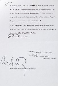 supplémentaires ; il porte à la fin une belle et grande signature d'Arletty. Texte d'hommage à Jacques Prévert (mort en avril 1977), très vraisemblablement composé par Paul Chambrillon, à partir de deux ouvrages qu'il cite (Arletty, La Défense ; Marcel Carné, La vie à belles dents). Le texte a sans doute été publié dans Le Spectacle du monde, sous le nom d'Arletty. Il y est surtout question des œuvres de Prévert portées à l'écran, dont celles dans lesquelles Arletty a joué un rôle. Au passage Les auteurs n'ont pas hésiter à citer l'opinion de Céline sur Prévert : " Un de mes amis, Céline, […] avait conscience de sa valeur de poète, et disait plutôt en quelque sorte : Comment ? Mais ce n'est pas possible qu'un imbécile pareil ait les mêmes idées que moi ! ".