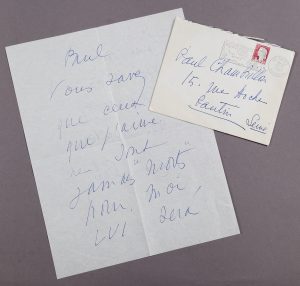 ARLETTY. Lettre autographe signée, adressée à Paul Chambrillon. [Belle-Île-en-Mer, sans date (avec enveloppe, cachet de la poste du 17 juillet 1961)]. 2 pages in-4 sur papier pelure. Exceptionnelle lettre écrite à l'occasion de la mort de...