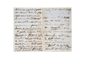 sur les autres péronnelles de toutes sortes qui ne m'ont pas laissé un instant de répit jusqu'à présent. Mme Triger et son chien jusqu'à près de six heures; puis ensuite, la mère Lanvin que je n'avais pas vue depuis un mois, me venait savoir de nos nouvelles et puis la pauvre femme m'a appris en même que ce pauvre vieux St Hilaire était tombé en paralysie depuis trois semaines. Pauvre digne homme les larmes m'en viennent aux yeux en t'écrivant cela: voilà plus de vingt ans que je connais ce vieillard, que je n'en ai jamais entendu dire que les choses les plus honorables. Il est vraiment navrant de penser que le pauvre vieillard n'a pas trouvé un appui, pas un secours dans son pays après avoir consacré toute sa vie à des travaux si non utiles, au moins consciencieux. Pourquoi ne suis-je pas la providence? [...] Je t'aime»...L.A.S. "Juliette", 2 July [1844], to Victor HUGO; 4 pages in-8. "You had counted on your other, my dear love, to read your moralities. But above all, you had counted on the other peronnelles of all kinds who have not given me a moment's respite until now. Mme Triger and her dog until nearly six o'clock; then mother Lanvin, whom I had not seen for a month, came to me to find out our news, and then the poor woman told me at the same time that poor old St Hilaire had been paralysed for three weeks. Poor worthy man, tears come to my eyes as I write this to you: I have known this old man for more than twenty years, and I have never heard anything but the most honourable things about him. It is truly distressing to think that the poor old man has not found any support, any help in his country after having devoted his whole life to work that was not useful, but at least conscientious. Why am I not providence? [...] I love you"...