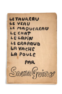 papier Johannot-Montgolfier d'Annonay, mine de plomb et encre de Chine. Maquette originale de cet album zoologique de neuf dessins, publié en 1906, comprenant les neuf dessins originaux, y compris La Bête à Bon Dieu, non mentionnée sur la page de titre, ainsi que la dédicace à Laurent Tailhade. Décrit comme un «album zoologique», il rassemble neuf caricatures de personnages, désignés par des noms d'animaux. L'album Le Taureau, Le Veau, Le Maquereau, Le Chat, Le Lapin, La Bête à Bon Dieu, Le Crapaud, La Vache, La Poule (Grande Imprimerie de Montrouge, H. Belleville, Paris, [1906]) a été publié très probablement à compte d'auteur, vendu 10 F (quelques exemplaires sur grand papier étaient réservés à l'auteur et ses familiers); il est constitué d'un titre formant couverture, d'une dédicace à Laurent Tailhade et de neuf planches de dessins de Sacha Guitry. PROVENANCE Sacha Guitry. La collection André Bernard (17-18 novembre 2011, n° 79).COLLECTION OF 9 ORIGINAL DRAWINGS, with title and dedication sheets, The Bull, The Calf, The Mackerel, The Cat, The Rabbit, The Toad, The Cow, The Hen [1906]; small notebook in-4 (26,3 x 18,8 cm) of 11 ff. on Johannot-Montgolfier d'Annonay paper, graphite and India ink. Original artwork for this zoological album of nine drawings, published in 1906, including the nine original drawings, including La Bête à Bon Dieu, not mentioned on the title page, as well as the dedication to Laurent Tailhade. Described as a "zoological album", it gathers nine caricatures of characters, designated by animal names. The album Le Taureau, Le Veau, Le Maquereau, Le Chat, Le Lapin, La Bête à Bon Dieu, Le Crapaud, La Vache, La Poule (Grande Imprimerie de Montrouge, H. Belleville, Paris, [1906]) was most probably published on author's account, sold for 10 F (a few copies on large paper were reserved for the author and his friends); it consists of a title forming a cover, a dedication to Laurent Tailhade and nine plates of drawings by Sacha Guitry. PROVENANCE Sacha Guitry. The André Bernard collection (17-18 November 2011, no. 79).