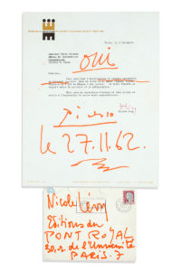 un livre d'André Vigneau. Picasso répond sur la lettre par un grand «Oui» au feutre orange, avec sa signature et la date autographes «Picasso le 27.11.62». L'enveloppe (jointe) est écrite au même feutre orange par Jacqueline Picasso.Autograph note signed on a typed letter addressed to him by Nicole Lévy of the Éditions du Pont-Royal, 22 November [1962]; 1 page in-4. Mme Lévy requests permission to reproduce a document in a book by André Vigneau. Picasso replies on the letter with a large "Yes" in orange felt-tip pen, with his autograph signature and date "Picasso le 27.11.62". The envelope (attached) is written in the same orange felt-tip pen by Jacqueline Picasso.